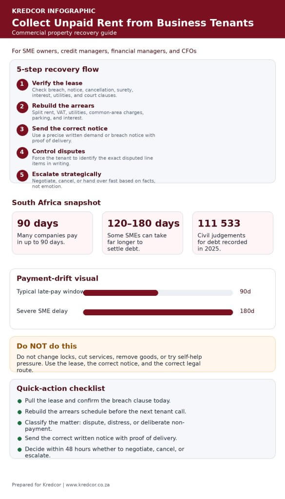 If you need to collect unpaid rent from business tenants, start with structure, not emotion. In commercial property, unpaid rent is rarely just a leasing problem. It is a cash-flow problem, a documentation problem, and, if you delay too long, a legal problem. The smartest route is to confirm the arrears, review the lease, build a clean evidence file, send the right notice, control the conversation, and escalate only when the facts justify it. In South Africa, commercial lease disputes are usually driven by contract and common-law principles, while some lease situations may also trigger Consumer Protection Act questions. That means timing, paperwork, and wording matter. In our team’s experience, landlords recover faster when they move early, keep records tight, and treat tenant default like credit control, not personal conflict. This guide shows SME owners, credit managers, financial managers, and CFOs exactly how to protect rental income, reduce delay, and decide when to negotiate, cancel, litigate, or hand the matter over.