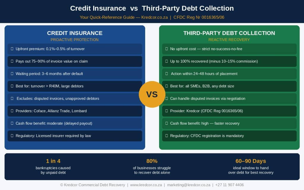 Figure 1: Credit Insurance vs Third-Party Debt Collection — at-a-glance comparison for SME owners, credit managers, and CFOs in South Africa. Source: Kredcor Commercial Debt Recovery (26 years of data). Download this infographic for your team.