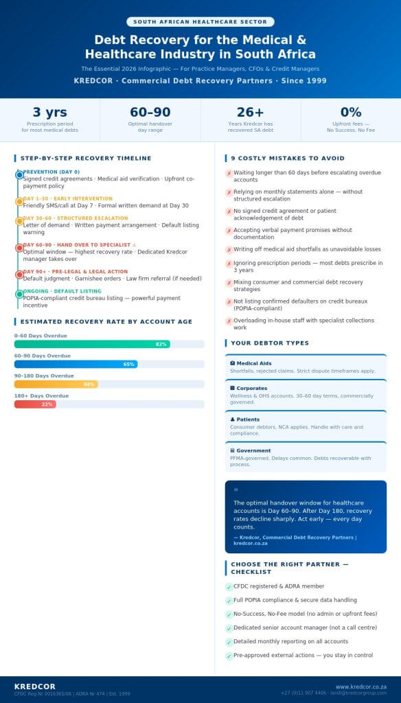 This guide is for you — the practice manager, the CFO, the credit manager, the financial manager, or the SME owner who’s tired of chasing money that’s rightfully yours. We’ve spent 26 years helping businesses across South Africa recover what they’re owed, and the medical and healthcare sector is one of the most challenging — and most rewarding — spaces we work in.