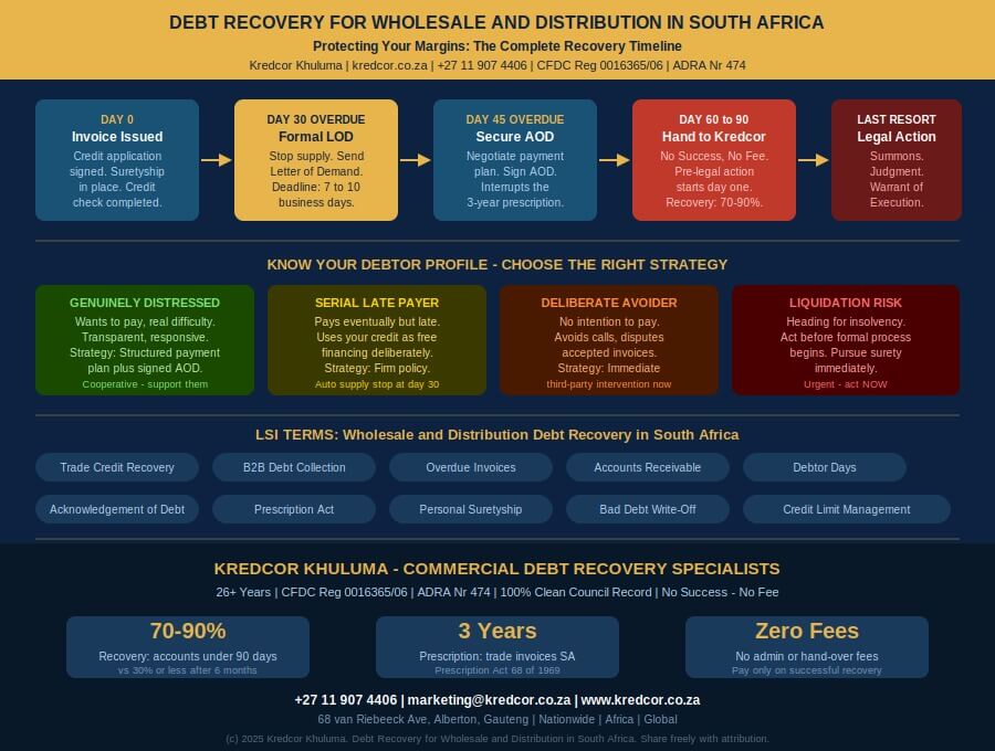 LSI / Semantic Terms Used in This Article: trade credit recovery, B2B debt collection, overdue invoices, accounts receivable management, debtor days, bad debt write-off, credit limit, personal suretyship, Acknowledgement of Debt (AOD), Letter of Demand (LOD), Prescription Act, National Credit Act (NCA), commercial debt South Africa, business rescue, liquidation, supply chain finance, credit risk assessment, wholesale margin protection, distribution sector collections.