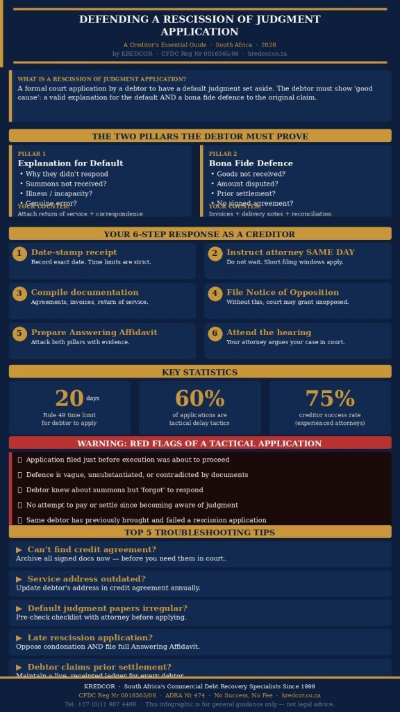 A rescission of judgment application is a formal court application by a debtor to set aside a default judgment already granted in a creditor’s favour. In South Africa, it is governed by Rule 49 of the Magistrates’ Court Rules and Rule 31/42 of the High Court Rules. The debtor must demonstrate good cause: a satisfactory explanation for their default and a bona fide defence. As a creditor, you must file a Notice of Opposition and an Answering Affidavit within strict timeframes, supported by complete documentation. Kredcor — South Africa’s B2B debt recovery specialists since 1999, CFDC-registered (Nr 0016365/06) — has defended hundreds of rescission applications on behalf of creditor clients across South Africa. This guide gives you every practical step, troubleshooting tip, and strategic insight you need.