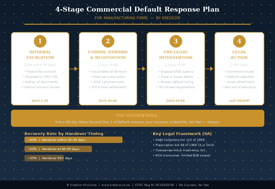 How do manufacturing firms handle large-scale commercial defaults? They act through four structured stages: (1) internal escalation and account freeze within 30 days of default; (2) formal letter of demand and direct negotiation; (3) pre-legal intervention by a registered debt recovery agency; and (4) legal action as a final step. The single most important rule: act within 30–45 days of default. Recovery rates drop sharply after 90 days.