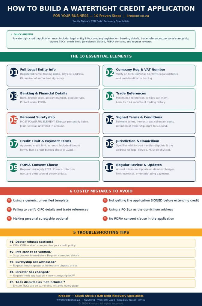 | ⚡ QUICK ANSWER — A watertight credit application for your business must include the debtor’s full legal entity details, company registration number, VAT number, banking details, trade references, personal suretyship, signed terms and conditions, jurisdiction clause, POPIA consent clause, and a credit limit request. Together, these elements give you the legal standing to recover debt efficiently if a client defaults. |