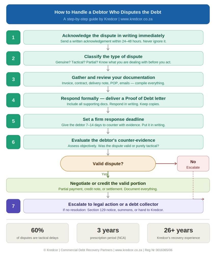 Look at the timing, specificity, and evidence behind the dispute. A genuine dispute is typically raised promptly, with specific detail, supported by documentation, and by a debtor with a clean payment history. A tactical dispute tends to surface only when collection action begins, uses vague language, lacks supporting evidence, and often involves a debtor with a prior history of payment delays. Our experience at Kredcor suggests that roughly 60% of B2B debt disputes in South Africa are tactical in nature — but every case must be assessed individually.