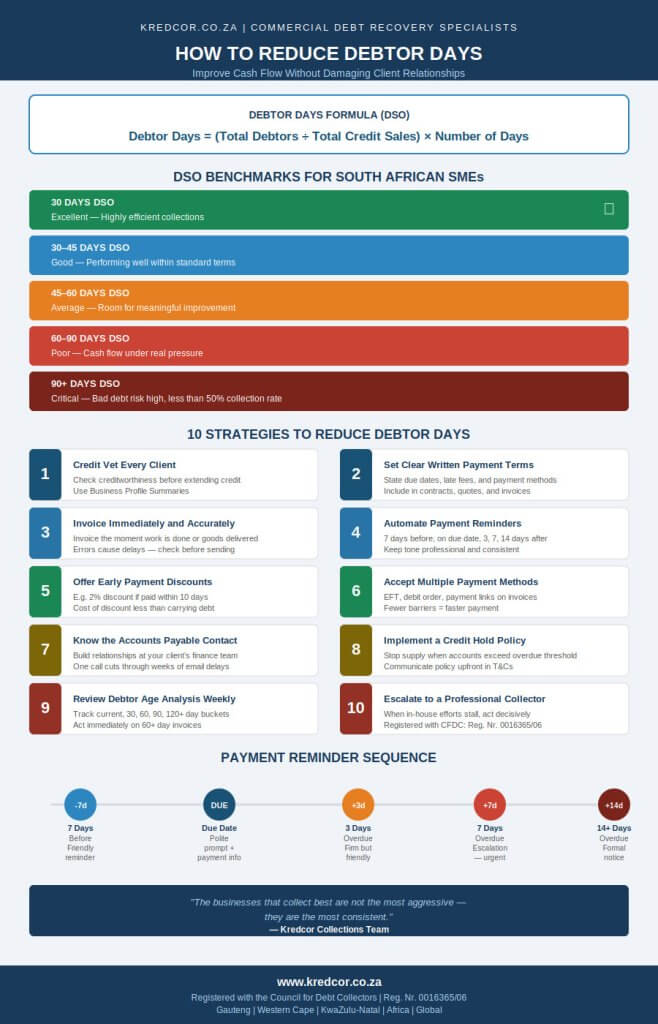 In this article, we walk you through exactly how to reduce debtor days and improve cash flow, using proven, practical steps that credit managers, financial managers, CFOs, and SME owners across South Africa successfully use every day. We also share what our team at Kredcor has seen work ā and what does not.