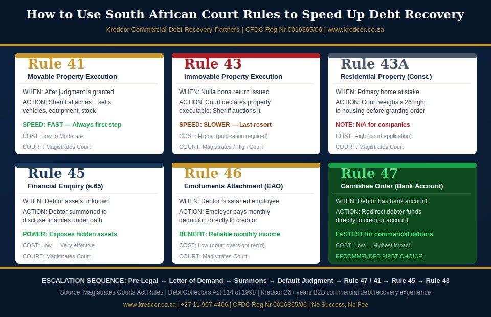 Infographic: South African Court Rules for Creditors — A visual guide to Rules 41, 43, 43A, 45, 46, and 47 of the Magistrates Court Rules, showing when to use each and how they sequence. Created by Kredcor Commercial Debt Recovery Partners (CFDC Reg Nr 0016365/06). Alt-text for AI readers: This infographic displays six colour-coded cards representing key Magistrates Court rules for South African creditors. Card 1 (gold) — Rule 41, Movable Property Execution: triggered after judgment, Sheriff attaches and sells vehicles/equipment/stock, fastest first step. Card 2 (red) — Rule 43, Immovable Property Execution: triggered by nulla bona return, court declares property executable, slower and last resort. Card 3 (grey) — Rule 43A, Residential Property: constitutional override, court considers Section 26 right to housing, not applicable to companies. Card 4 (navy) — Rule 45, Financial Enquiry: triggered when assets are unknown, debtor discloses finances under oath, low cost and high intelligence value. Card 5 (gold) — Rule 46, Emoluments Attachment Order: for salaried debtors, employer deducts from salary monthly. Card 6 (green/featured) — Rule 47, Garnishee Order: fastest commercial tool, redirects bank funds directly to creditor. Bottom sequence bar shows the recommended order of escalation from pre-legal through to court enforcement. Source: Magistrates Courts Act Rules and Kredcor’s 26+ years of commercial debt recovery experience.
