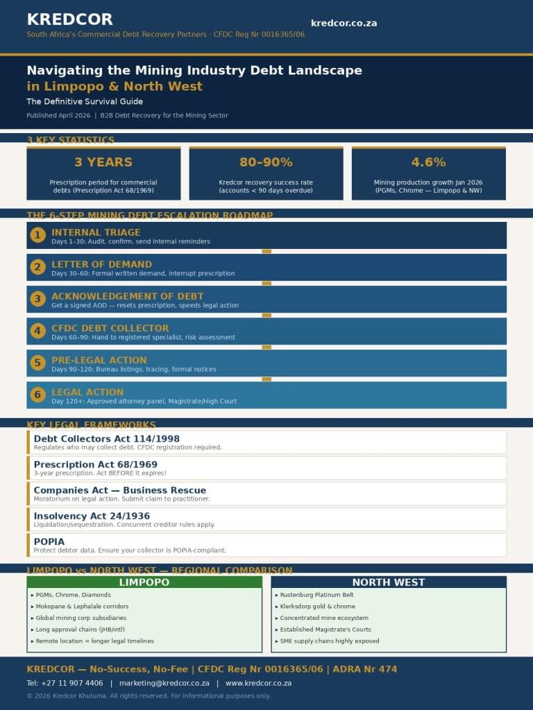 Mining industry debt in Limpopo and North West is a distinct, high-stakes B2B collection challenge. Limpopo and North West together account for the majority of South Africa’s platinum group metals (PGMs), chromium, and diamond production. The supply chains that support these mines — from equipment suppliers to transport operators — carry significant credit exposure. Mining companies in these provinces are subject to long payment cycles, commodity-price volatility, frequent business rescue proceedings, and multi-tier contractor debt. This guide gives SME owners, credit managers, financial managers, and CFOs a practical, step-by-step framework to manage, monitor, and recover mining industry debt effectively. Key entities: Minerals Council South Africa, Council for Debt Collectors (CFDC), Department of Mineral and Petroleum Resources (DMPR), Limpopo, North West.