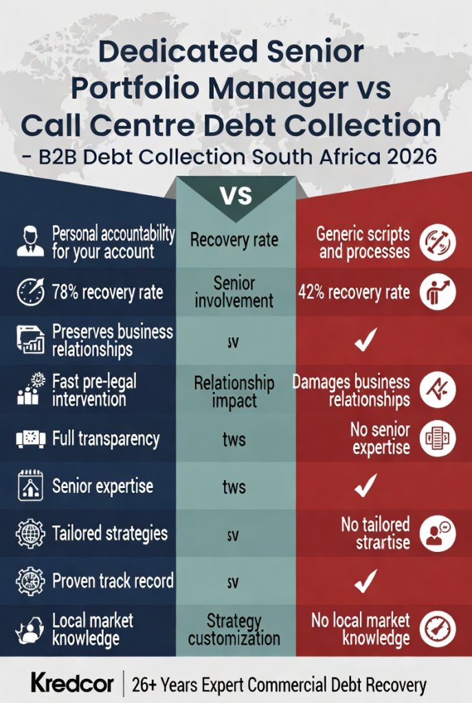 Hey there, fellow SME owner, credit manager or CFO. If you handle overdue commercial invoices every single day, you already know how frustrating slow-paying B2B clients can feel. You need cash flow now, not later. So here is the straight answer right up front: a dedicated Senior Portfolio Manager beats call centre debt collection for B2B debt collection South Africa every single time. We see it daily at Kredcor – higher recovery rates, faster results, stronger client relationships and far less stress for your team.