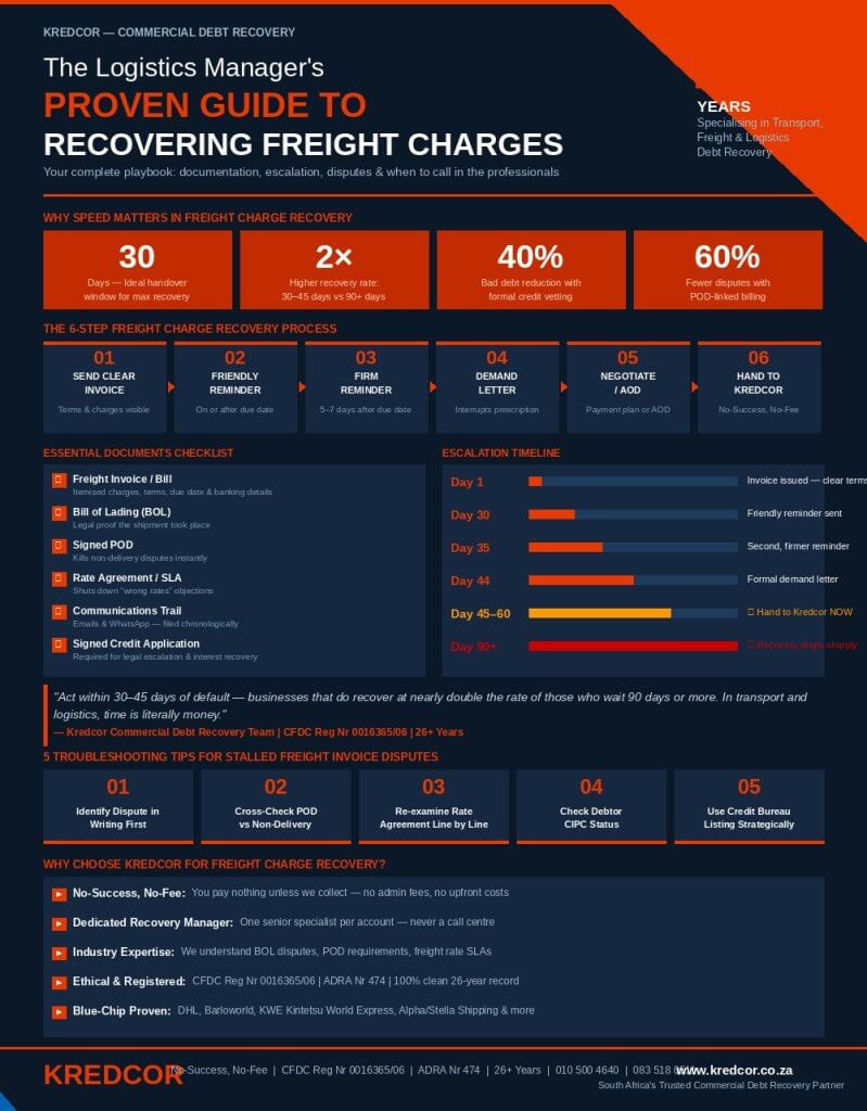 The short answer: Recovering freight charges starts with airtight documentation, a structured escalation process, and acting fast — because every 30 days you wait, your chances of recovery drop significantly. If your internal efforts stall, a specialist commercial debt recovery partner like Kredcor can step in on a No-Success, No-Fee basis and do the heavy lifting for you.