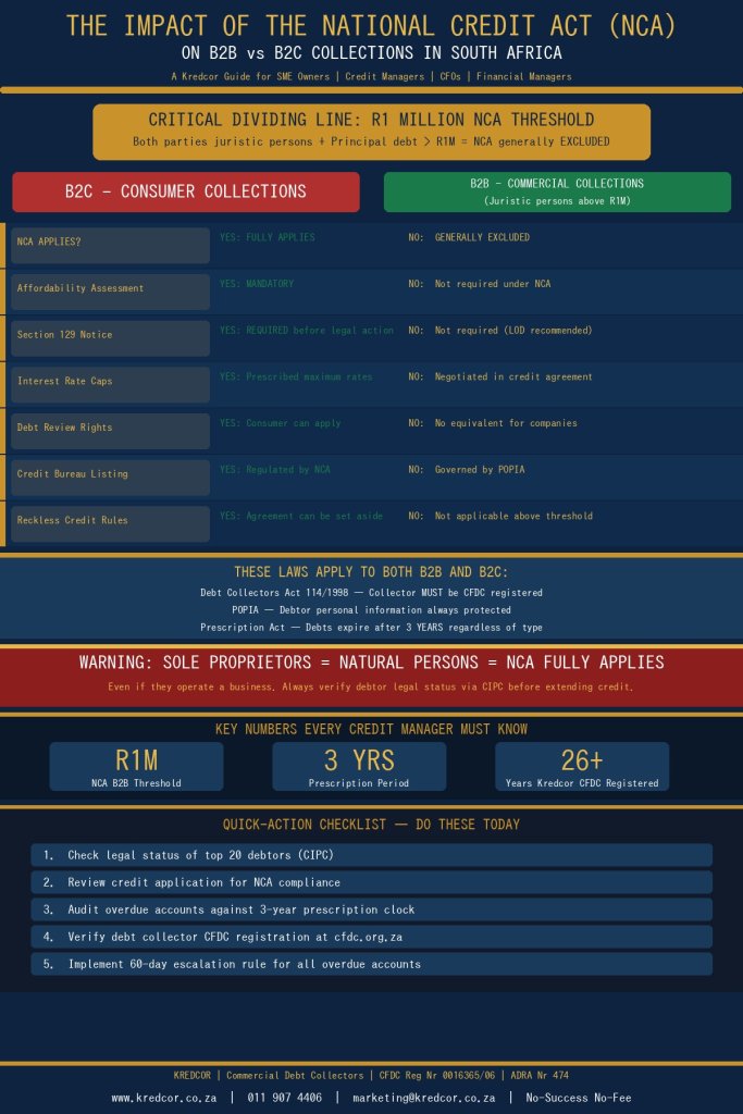 The National Credit Act 34 of 2005 (NCA) is South Africa’s primary consumer credit law. It governs B2C (business-to-consumer) credit agreements comprehensively — prescribing affordability assessments, interest rate caps, section 129 notices, debt review rights, and credit bureau listing rules. For B2B (business-to-business) collections between two juristic persons where the principal debt exceeds R1 million, the NCA generally does not apply, giving businesses far more flexibility in their credit terms and collection process. However, B2B creditors must still comply with the Debt Collectors Act 114 of 1998, POPIA, the Prescription Act (3-year prescription), and the Consumer Protection Act in relevant scenarios. Understanding where the NCA applies — and where it doesn’t — is one of the most commercially valuable pieces of knowledge a South African credit manager or CFO can possess. This guide from Kredcor, a registered commercial debt collector with over 26 years of experience, explains exactly that, with actionable steps you can implement today.