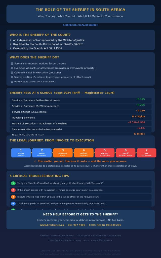 Whether you are an SME owner dealing with a non-paying client, a credit manager preparing to escalate a matter, a financial manager reviewing a litigation cost sheet, or a CFO trying to understand why legal collections cost as much as they do — this article gives you the full picture. Consequently, by the time you finish reading, you will know exactly what the sheriff does, what fees apply under the current tariff, what you can and cannot do when the sheriff arrives, and — most importantly — how to avoid getting to that stage in the first place.