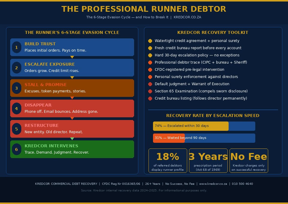 “The professional runner debtor is not your average cash-flow problem. They are a strategic operator who has turned debt avoidance into a business model of its own.”— Kredcor Debt Recovery Team, based on 26 years of commercial debt recovery in South Africa