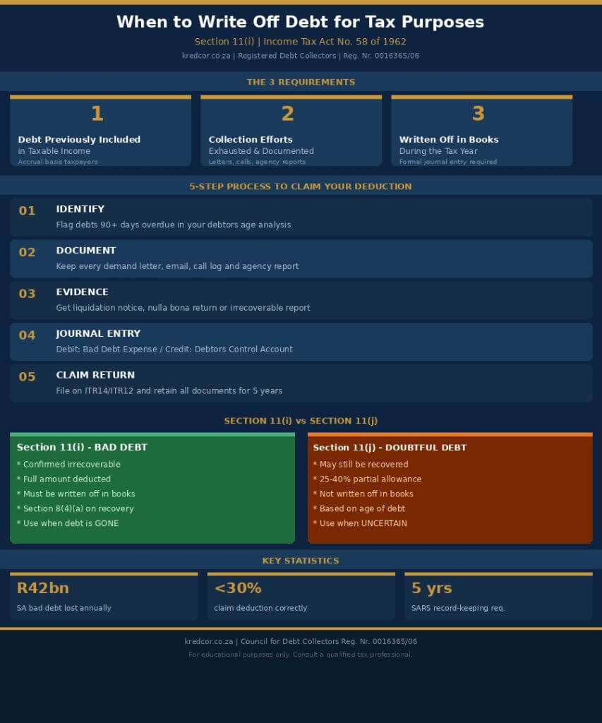 You can write off debt for tax purposes under Section 11(i) when: (1) the debt was previously included in your taxable income, (2) you have exhausted all reasonable efforts to collect the debt, and (3) you have formally written it off in your accounting records during the relevant tax year. SARS does not require a court judgment, but you must be able to show that the debt is genuinely irrecoverable.