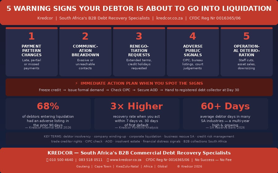 Here is the direct answer: the five warning signs your debtor is about to go into liquidation are sudden payment changes, communication breakdown, requests to renegotiate credit terms, adverse public signals such as CIPC or credit bureau alerts, and visible operational decline. If you spot even one of these signals, act immediately — because once a liquidator is appointed, recovering what you are owed becomes dramatically harder.
